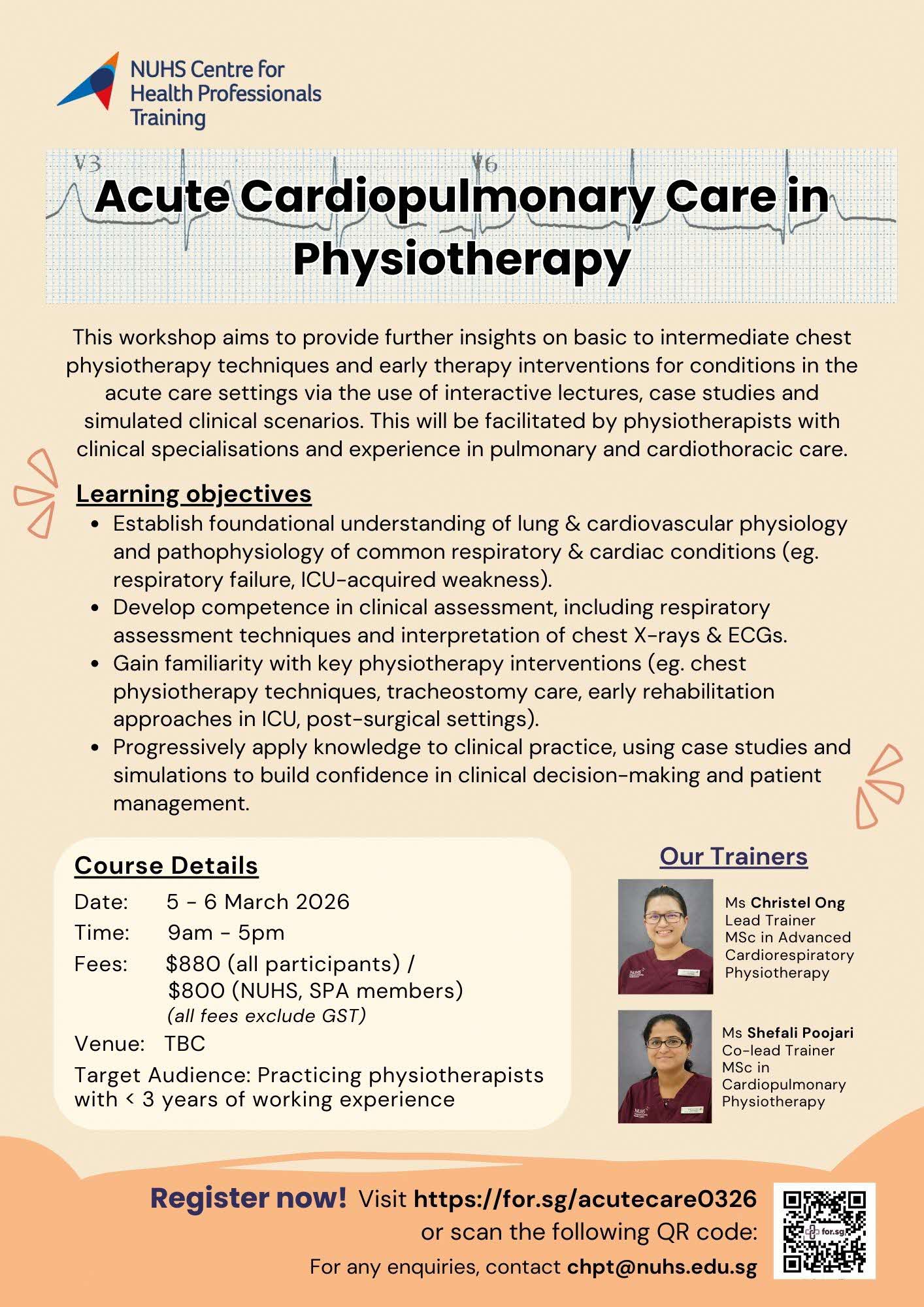 This workshop aims to provide further insights on basic to intermediate chest physiotherapy techniques and early therapy interventions for conditions in the acute care settings via the use of interactive lectures, case studies and simulated clinical scenarios. This will be facilitated by physiotherapists with clinical specialisations and experience in pulmonary and cardiothoracic care.